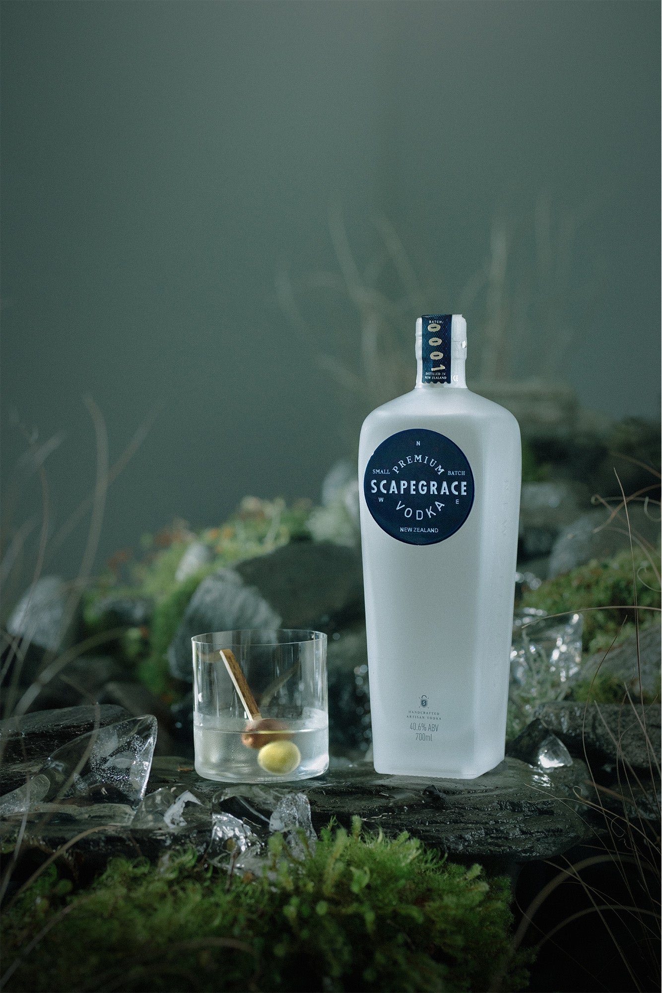 Strain into a low glass, garnish with a large olive or caper-berry on an bamboo spike.