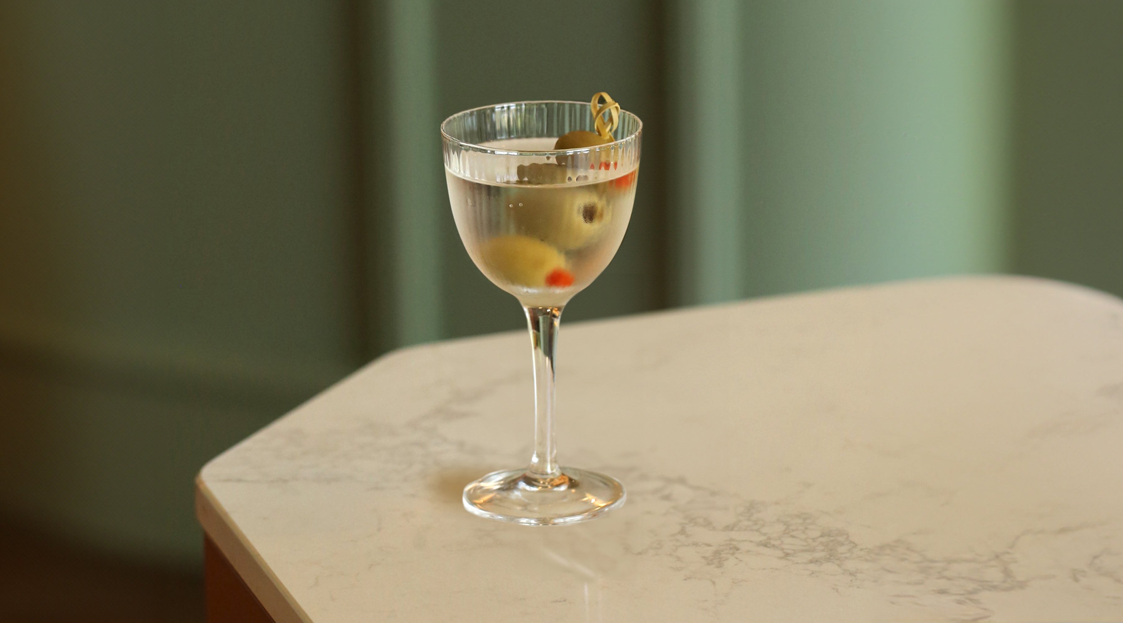 Add all ingredients to a mixing glass, pack with cubed iced and stir until the mixing glass is frosted. Strain into chilled martini glass and garnish with cured olives.