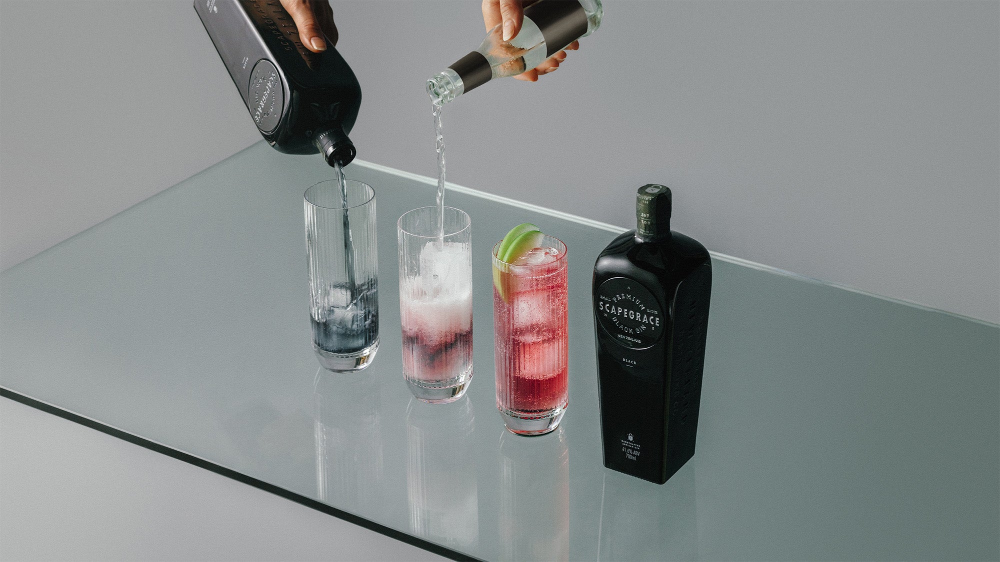 Build glass with ice, add Scapegrace Black, top with Tonic Water, garnish with slice of green apple.