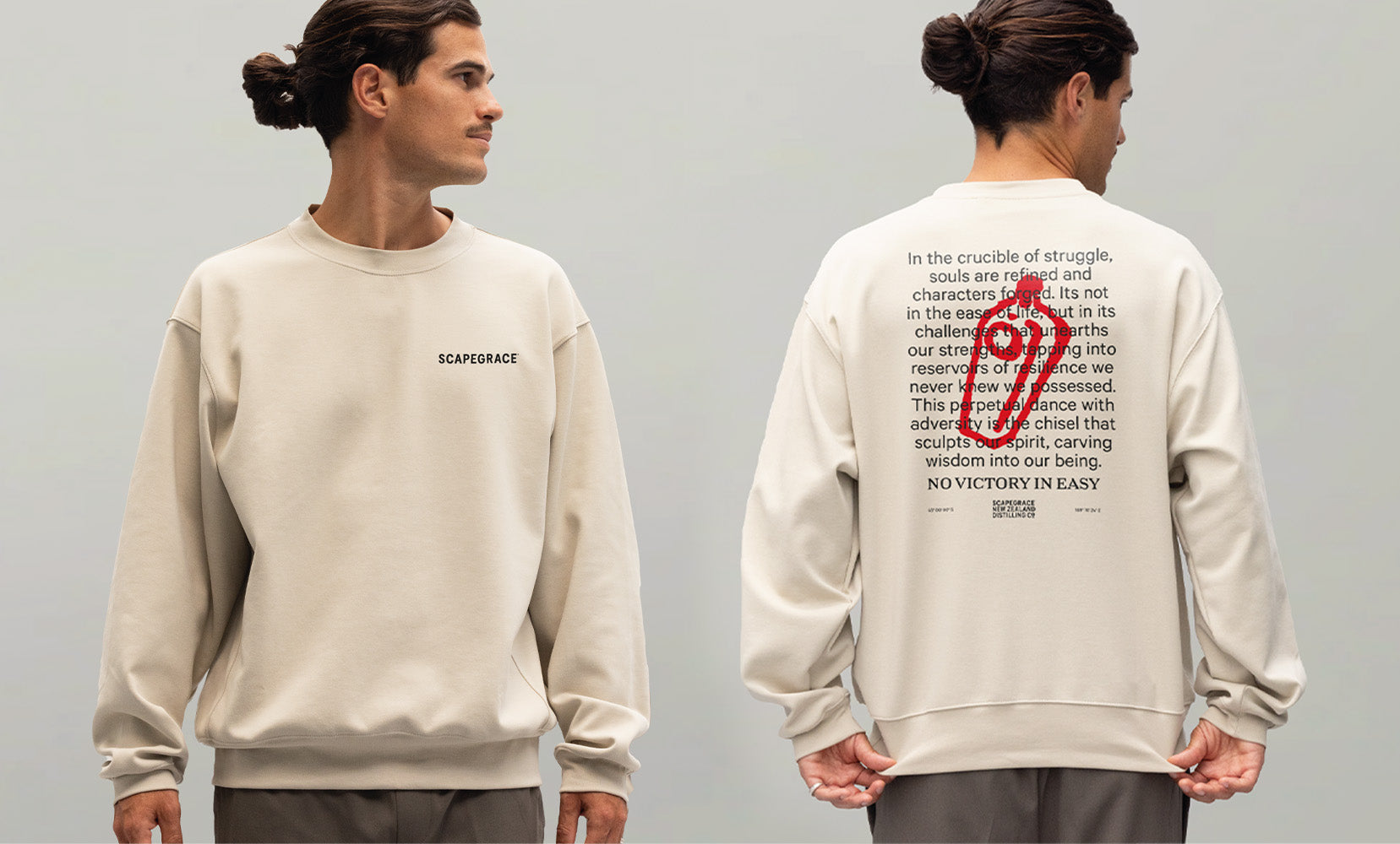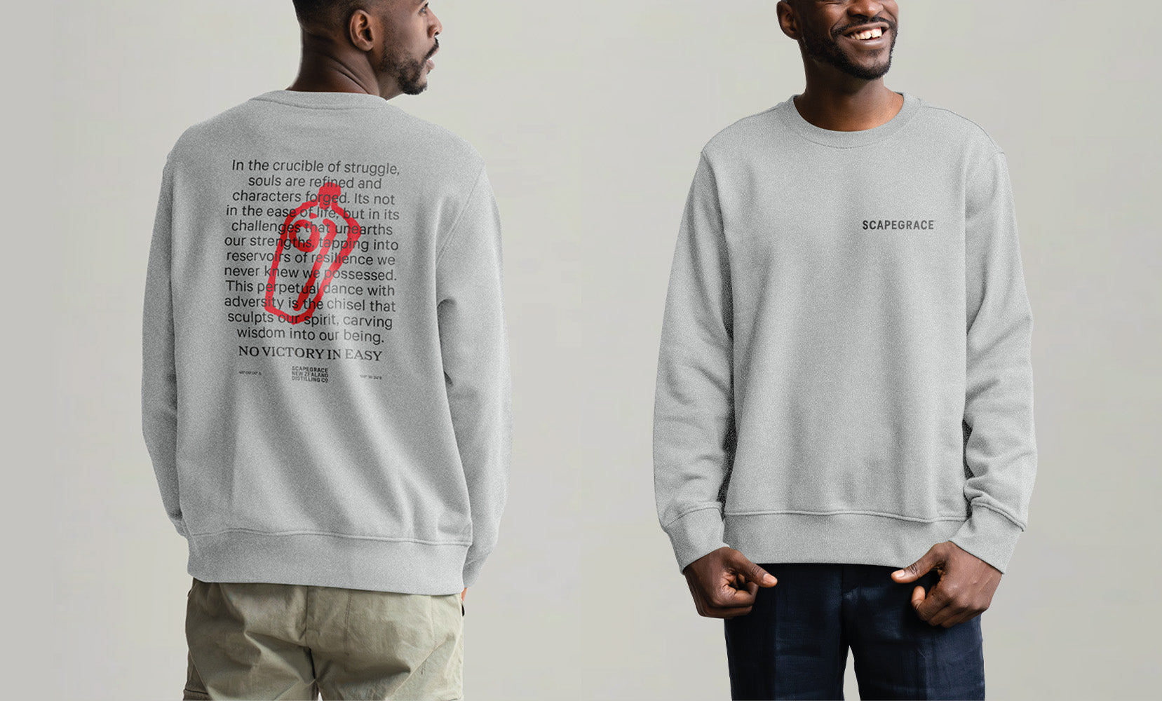 Scapegrace logo on the front left chest and a bold graphic illustration with text on the back. Available in two colours: